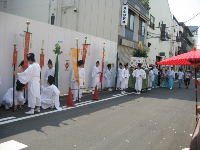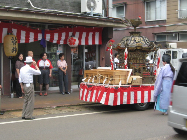 車での神輿渡御。宮司さんは、行く先々で、立ち止まり、お払いをします。