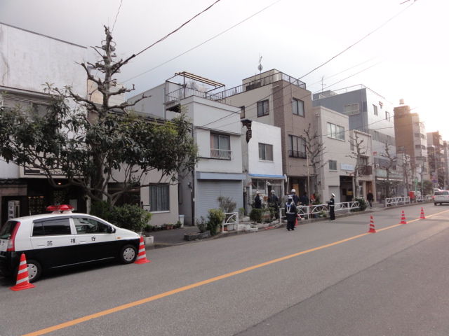 まったく動かない蔵前通り、亀戸香取神社前。今日明日は商店街のオープン記念で、パレードなどがある予定でしたが、すべて中止。
