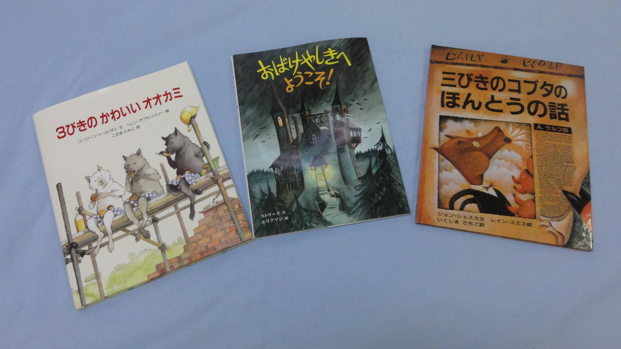 三びきのかわいいオオカミ、三びきのコブタのほんとうの話、おばけやしきへようこそ。孫のためにとおもい、絵本を買いました。