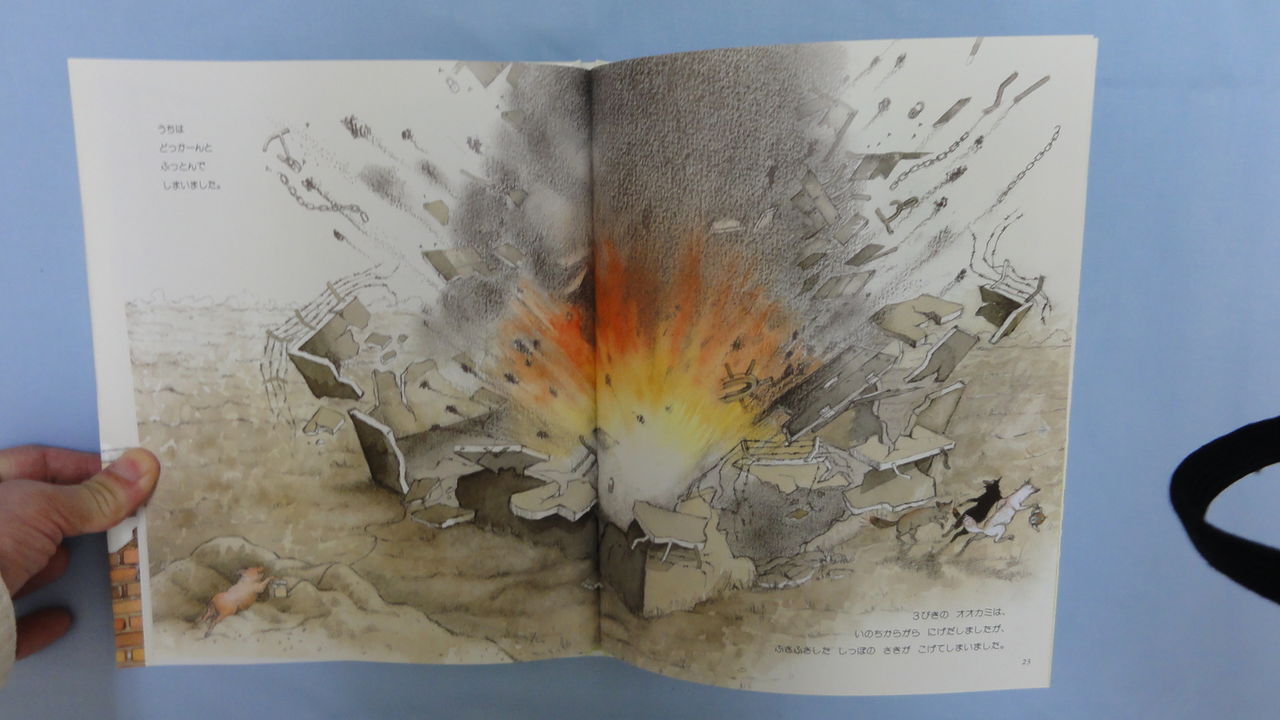三番目の家は鉄板と鎖と錠前で出来ていたのに、ダイナマイトで爆破されてしまい、子オオカミたちはシッポを焦がしながら、命からがら逃げ出していくという話です。他の絵本も三びきのコブタを食べた犯罪者オオカミの独白。