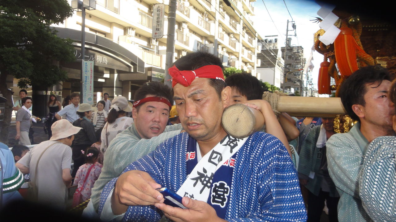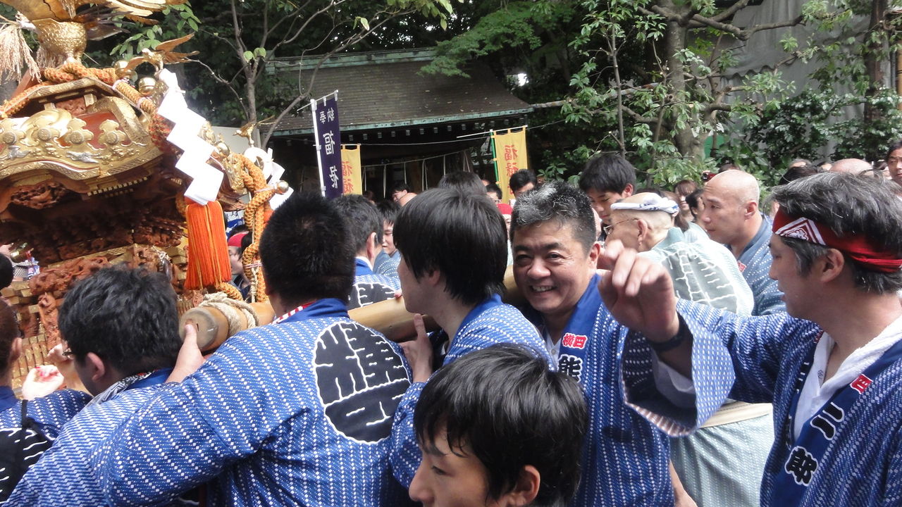見物にだけ行くよと言ってたのに、いつの間にか半纏着て担いでるのは、関根〜。