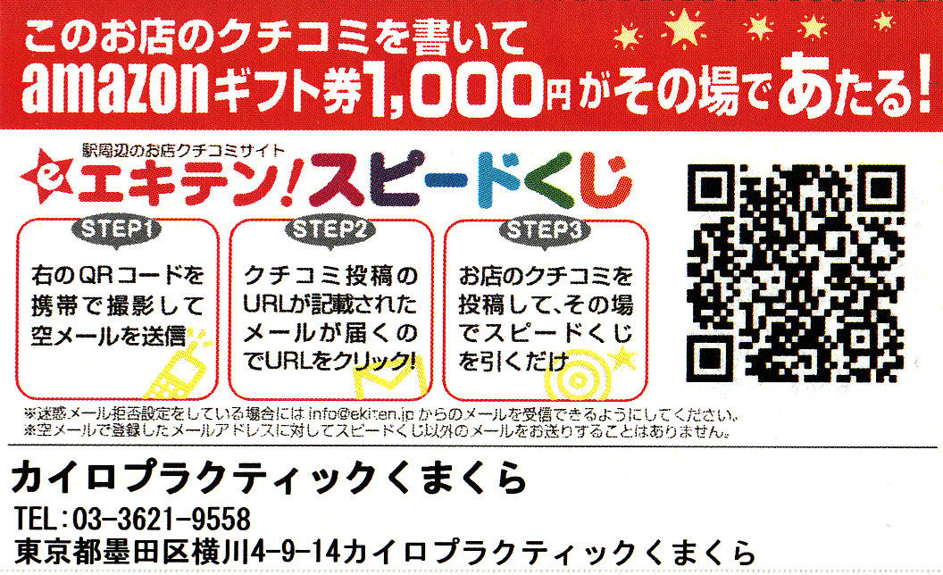 ニュースレターにも書きましたが、駅の近くでお店を探す、エキテンというサイトがあります。そこにカイロプラクティックくまくらも掲載されていて、お店の口コミを書いてもらうと、アマゾンで図書券が1000円当たる、かもしれないスピードくじがあります。
