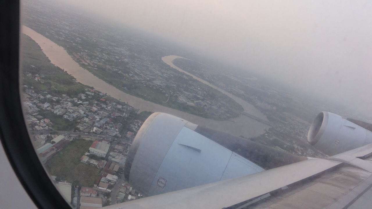 ベトナムの上空、メコン川のうねりが見えます。