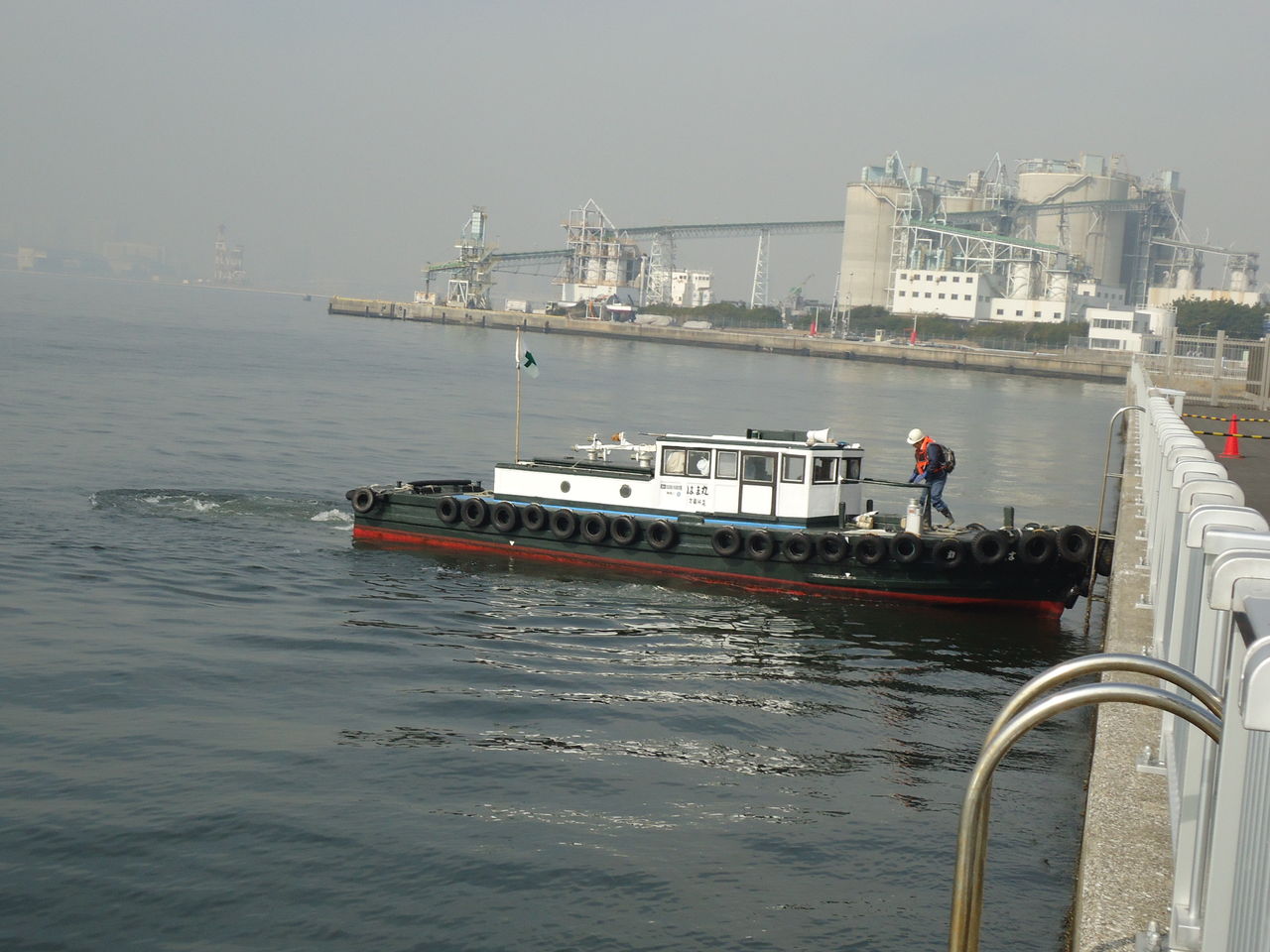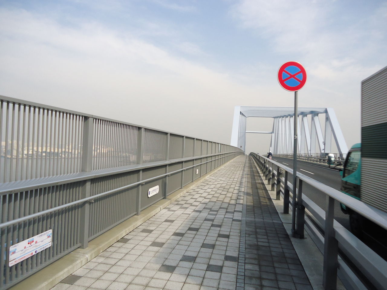車のタイヤが通り過ぎると、巨大な蛙が鳴くような音がする継ぎ目もあり、東京都港湾局の職員の方が橋の点検をしていましたが、欄干の外に2人出ています。