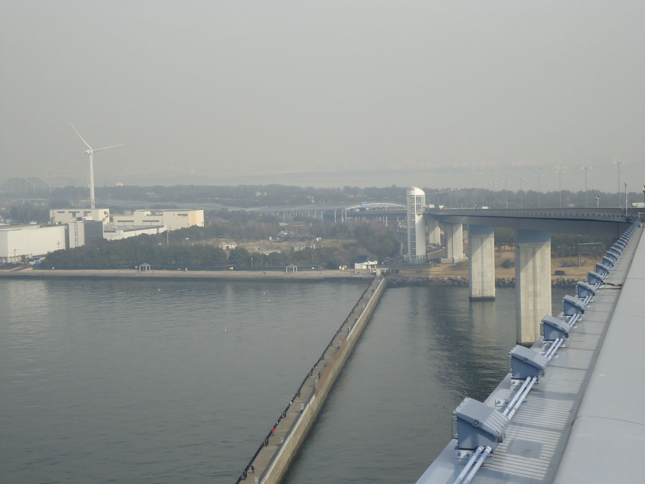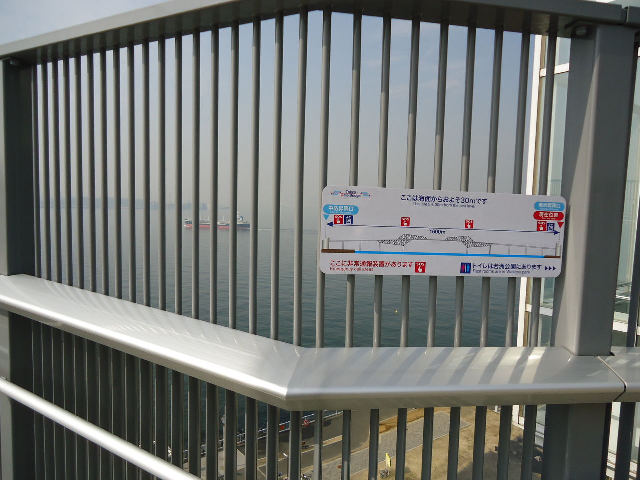 東京ゲートブリッジに登るエレベーターは上が展望室になっていて、ここで地上31メートル位で、一番高い橋の真ん中は海上から61メートルになってました。
