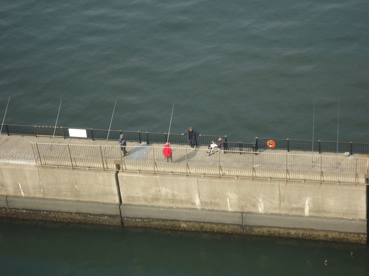 この日は霧が出ていてスカイツリーは見えませんが、若洲海浜公園、キャンプ場、風車が見え、真下には釣り人がいます。