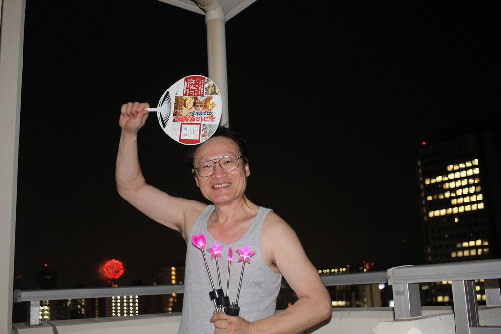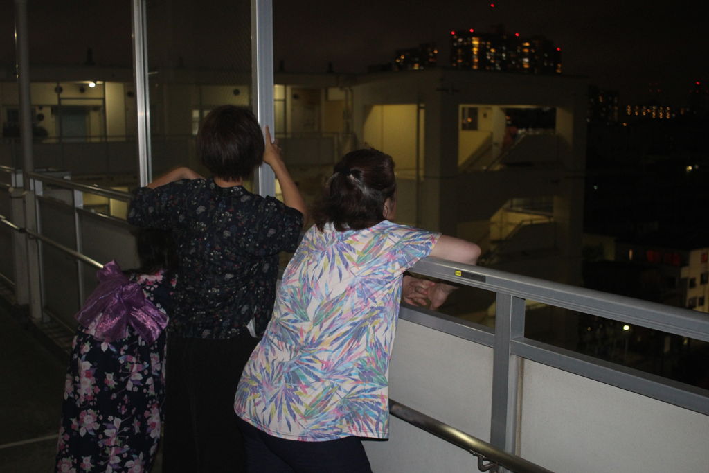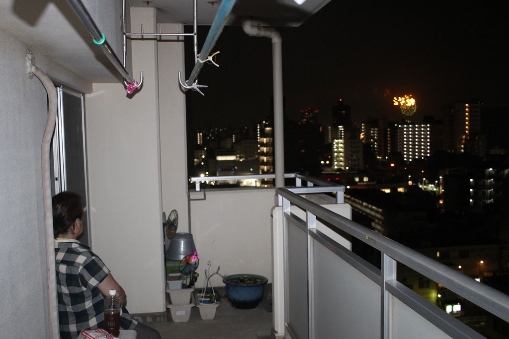 家に帰ると、今日は飲み会だったはずのクマママがのんびり花火見物、早帰りか。