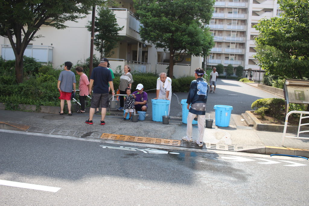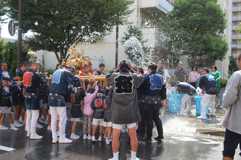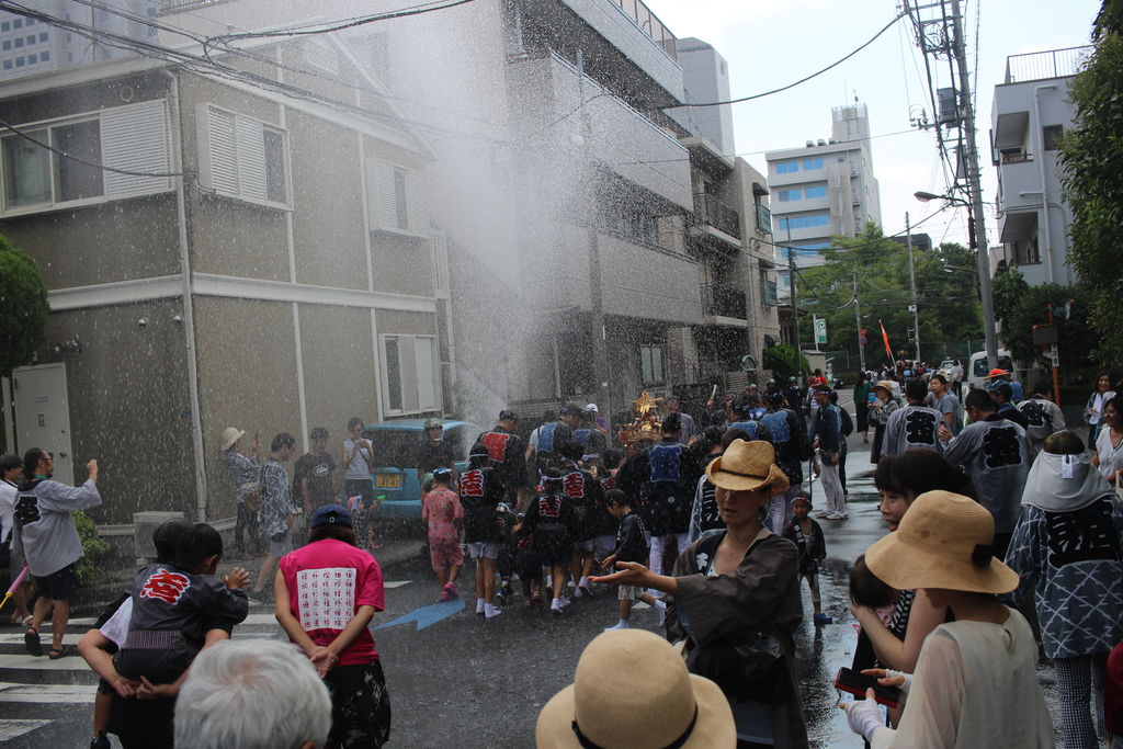 町内を回ってくるお神輿に待ち構えて水かけです。この日も気温は35℃の猛暑。