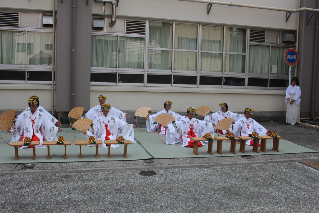 朝早くから巫女さんの行列で小学生も歩いていました。