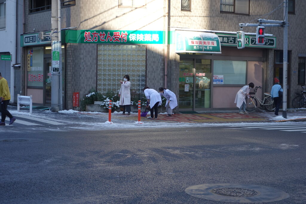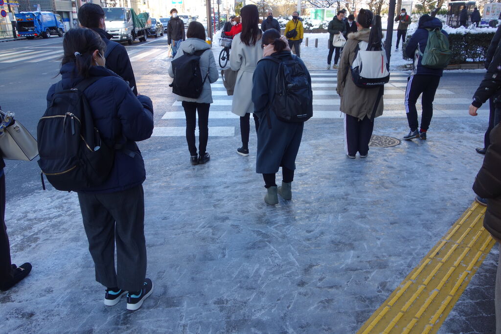 明けた朝は凍り付いて横断歩道もつるつるで、お巡りさんもスコップを持っています。