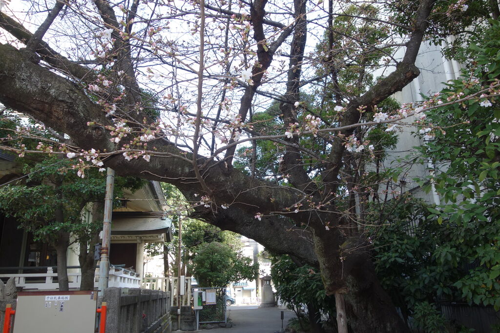 今日、猿江神社を通ると桜が咲いていました。靖国と同じ日に咲いてますね。