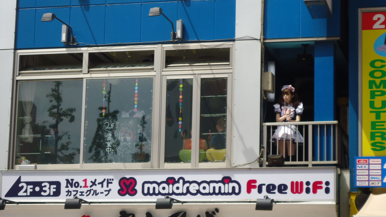 メイドさんや巫女さんが店の前で客引きしてます。