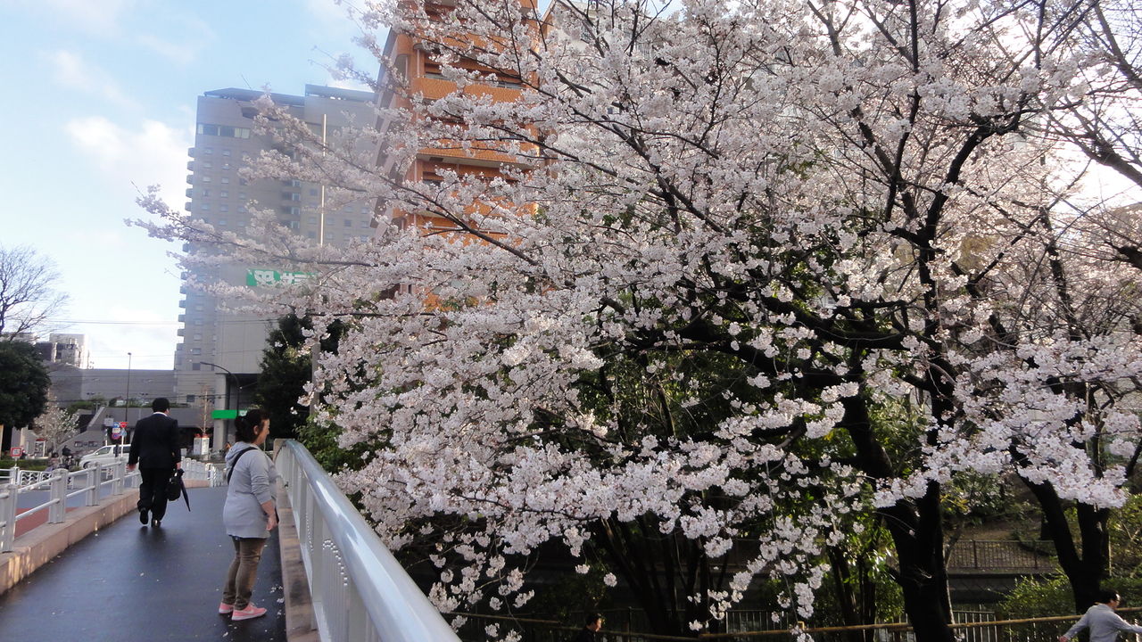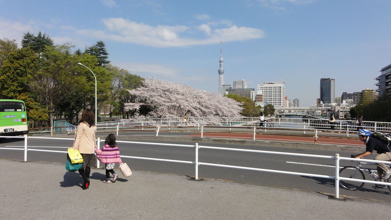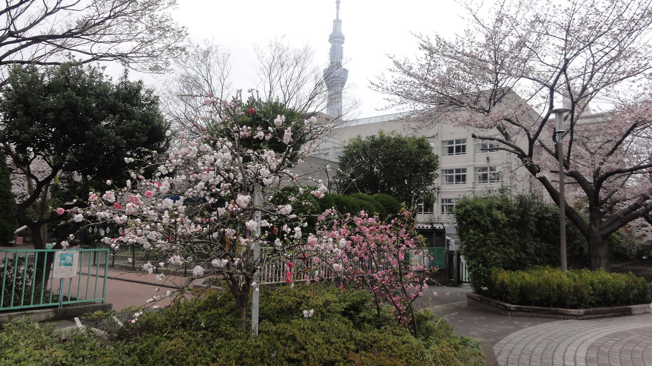 女の子はジャンプで男の子は木のぼりで、スカイツリーに迫っています。