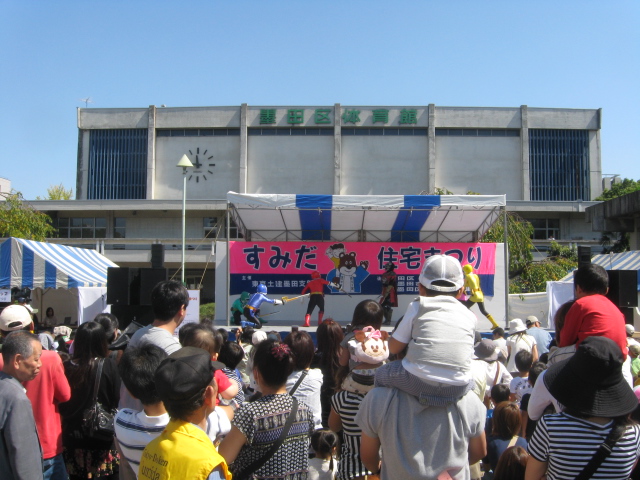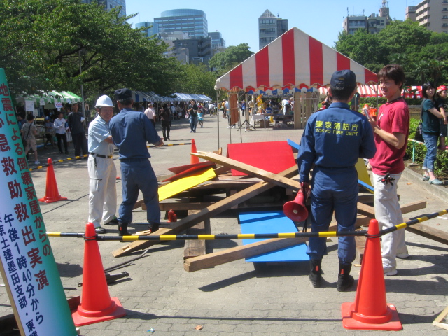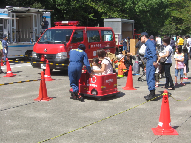 錦糸公園の住宅まつりでは、消防署が、地震災害の避難方法、ミニ消防車の乗車などをやってました。