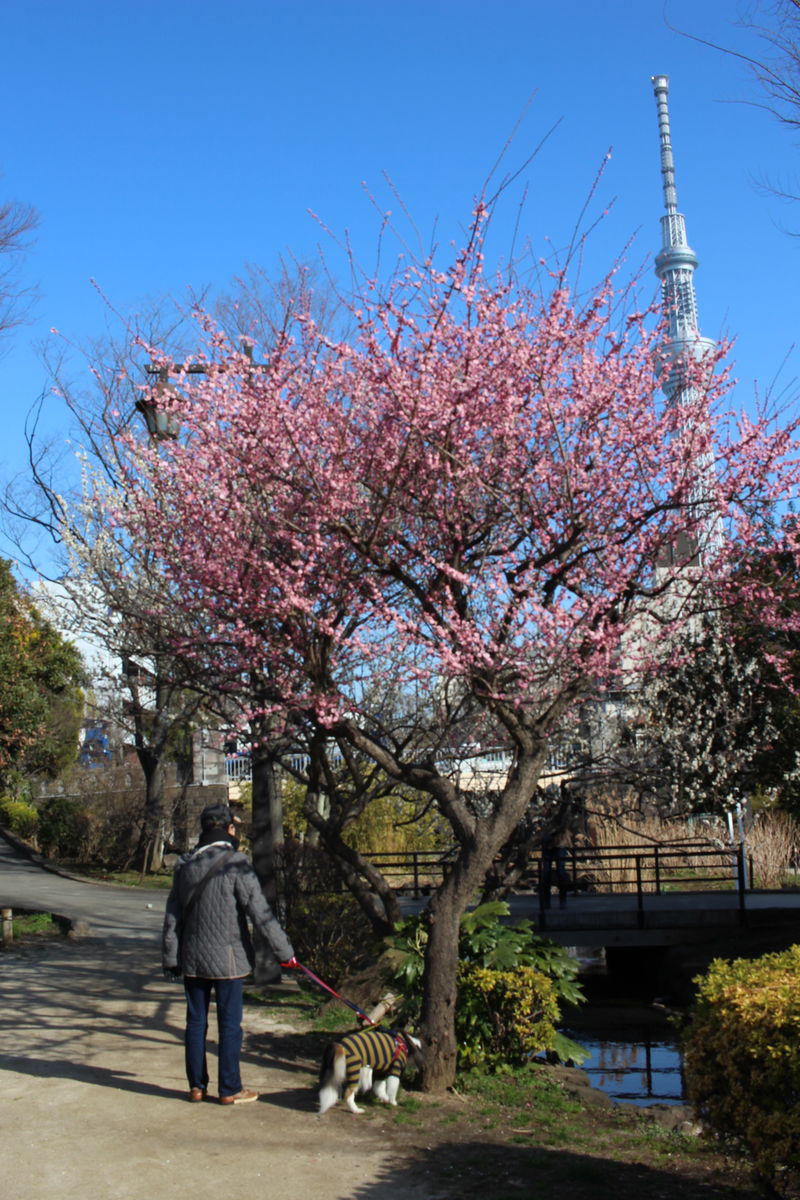 大横川親水公園でも梅が満開です。橋の下にもう一匹ワンコが散歩に来てるのが、判るかなあ。