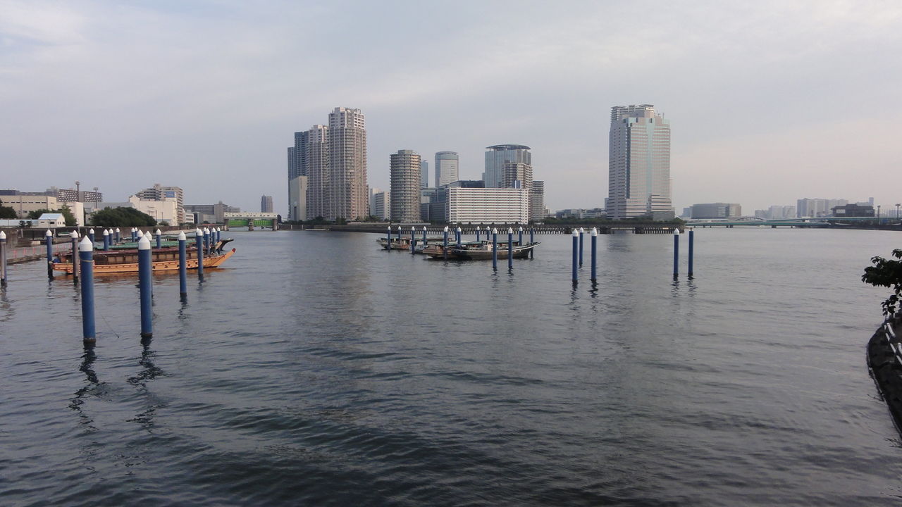 隅田川に浮かぶ豊洲の高層マンションと屋形船、海洋大学の明治丸。