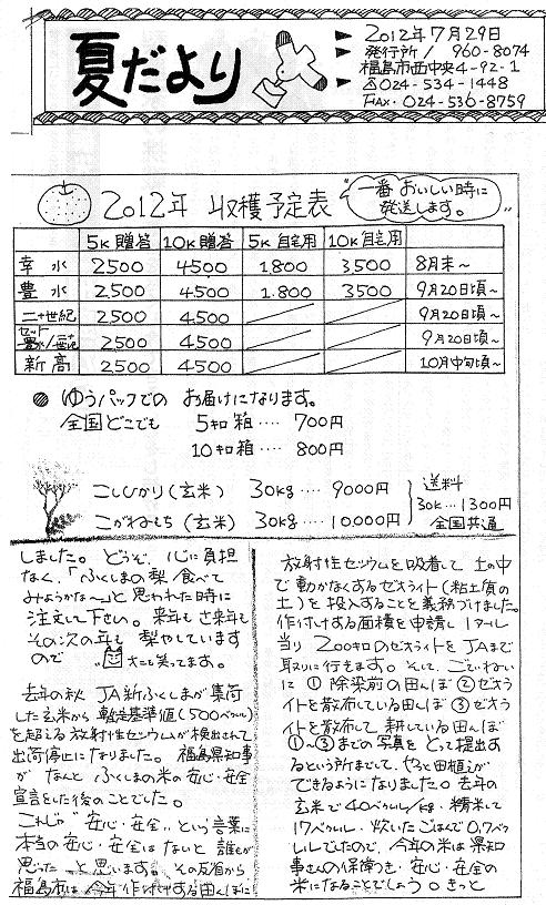 福島の友人ONEチャン、阿部一子さんから夏だよりが届きました。もし梨が放射能で出荷できなかったらどうしよう、といっていたのですが、大丈夫なようです。