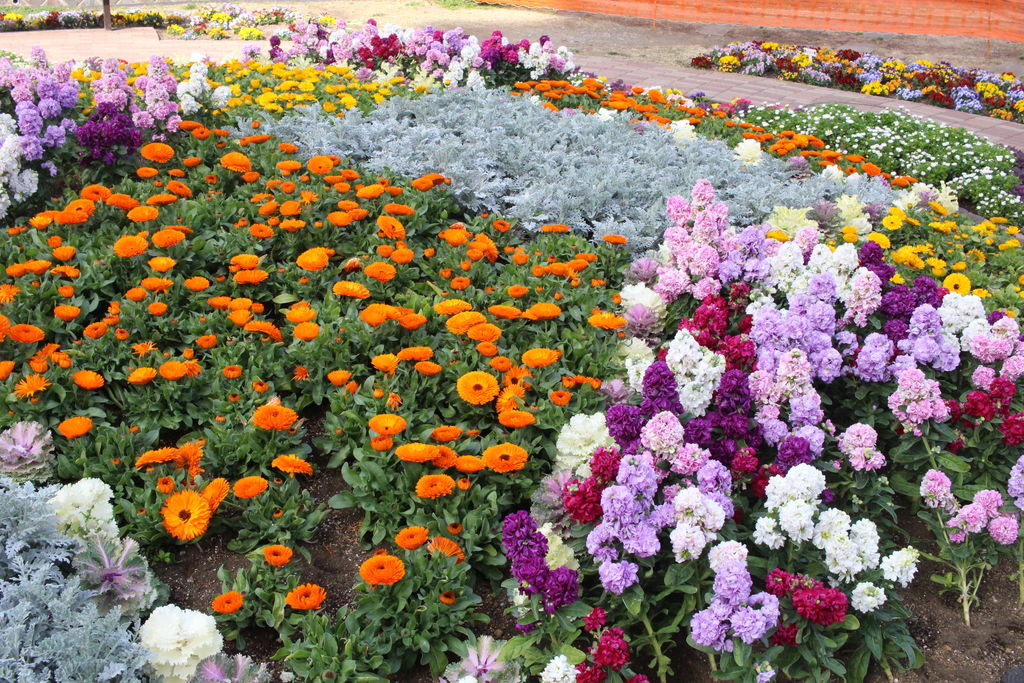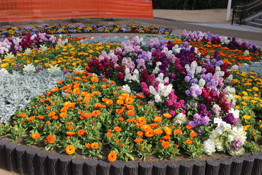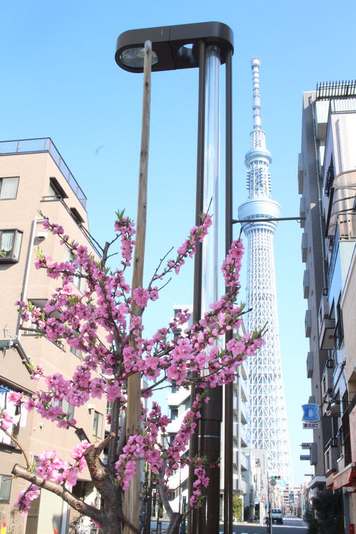 タワービュー通りのハナモモが今年も咲き始めました。業平橋のたもとの花壇も整備されてきれいです。